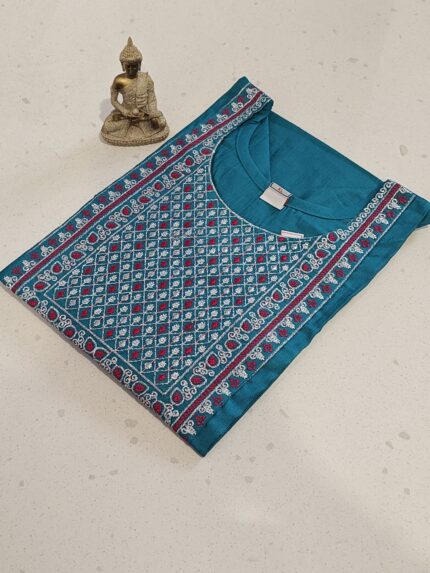 - Stylish round neckline enhanced with delicate mirror work detailing