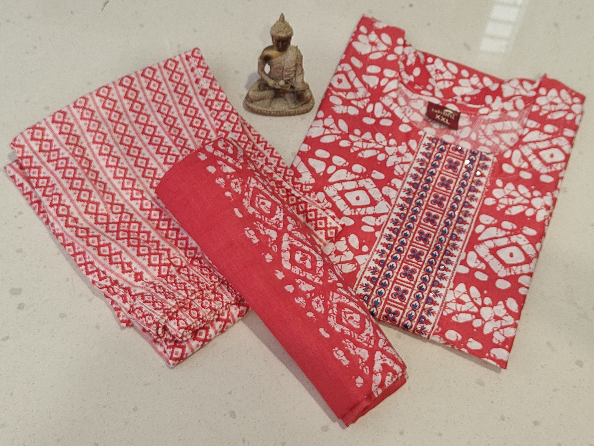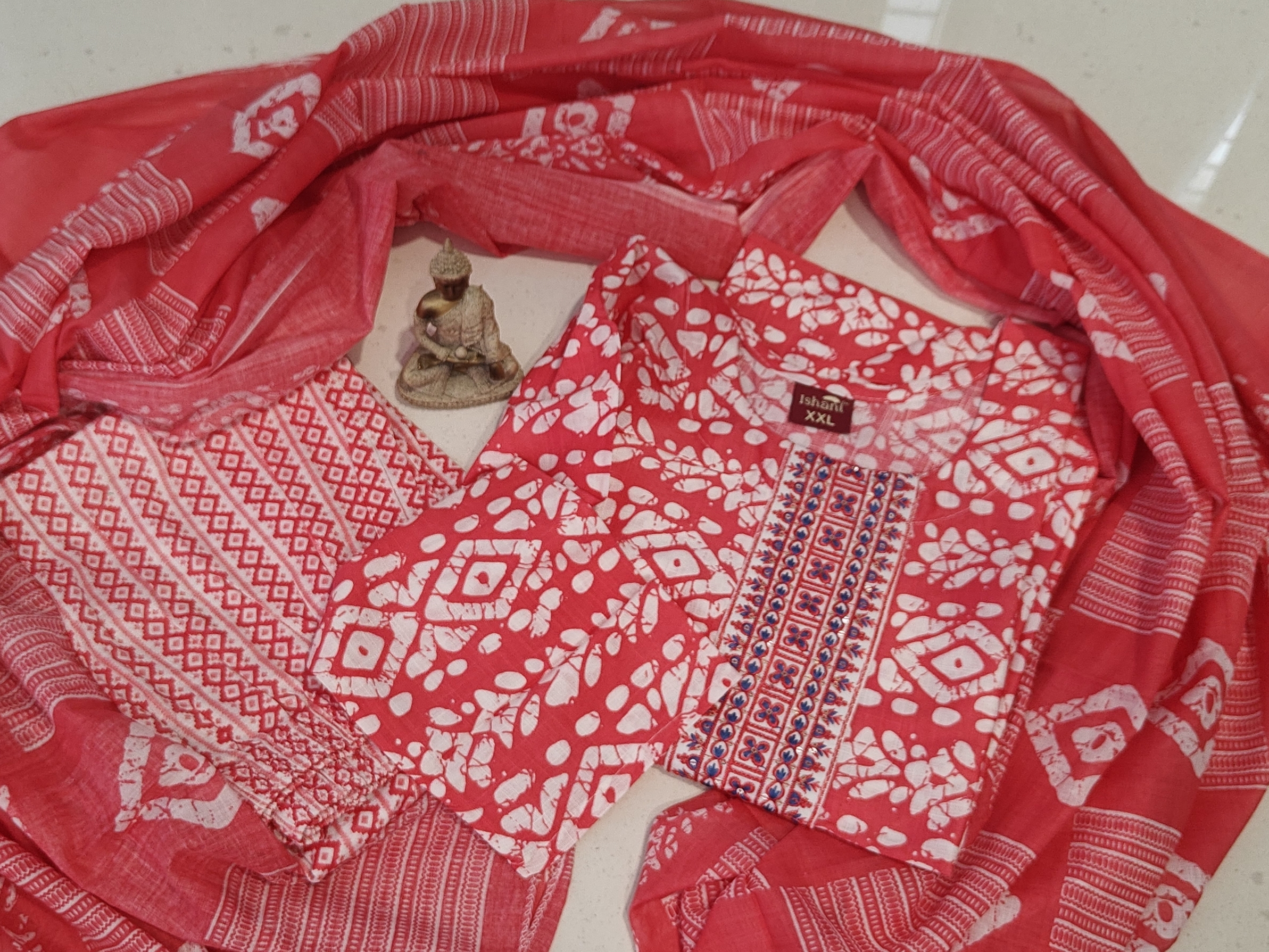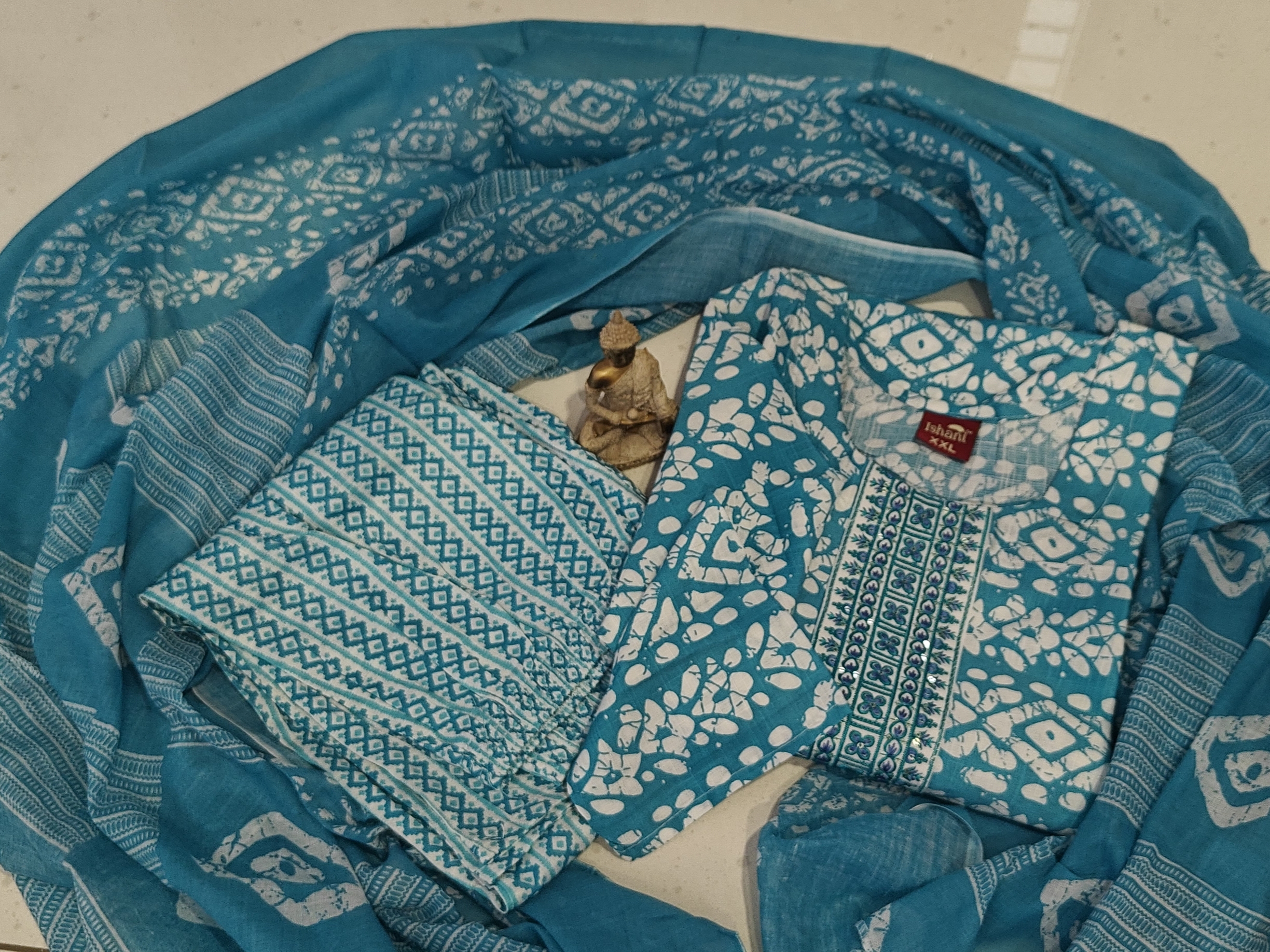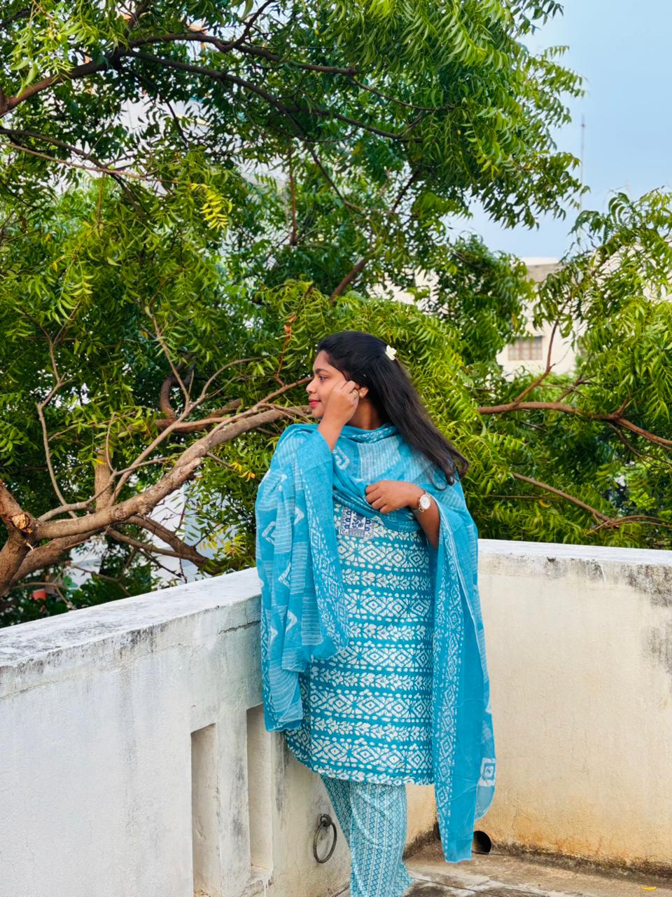 - This is a super soft blue-toned Batik Cotton, three-piece ethnic Indian outfit, which is a type of kurta set. The ensemble consists of a kurta (tunic), pants, and a dupatta (scarf). The fabric appears to be a lightweight material, super soft a cotton blend, that drapes well and is comfortable for daily wear. The entire set is a light to medium blue color, with a repeating white or off-white geometric pattern that covers all three pieces. The kurta is a straight-cut style with a round neck and three-quarter length sleeves, and it reaches approximately calf-length. The pants are also printed with the same pattern, and the dupatta is a sheer, flowing scarf that complements the rest of the outfit. The overall look is casual yet stylish, suitable for everyday outings.