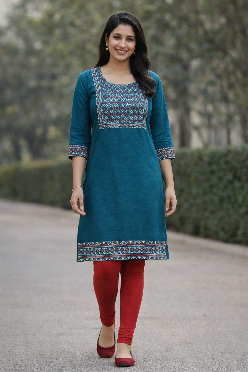 The dress is a women’s ethnic wear kurti, its a deep teal green color and embroidered details. The garment appears to be made from a comfortable fabric of cotton with art silk, suitable for casual or semi-formal occasions.