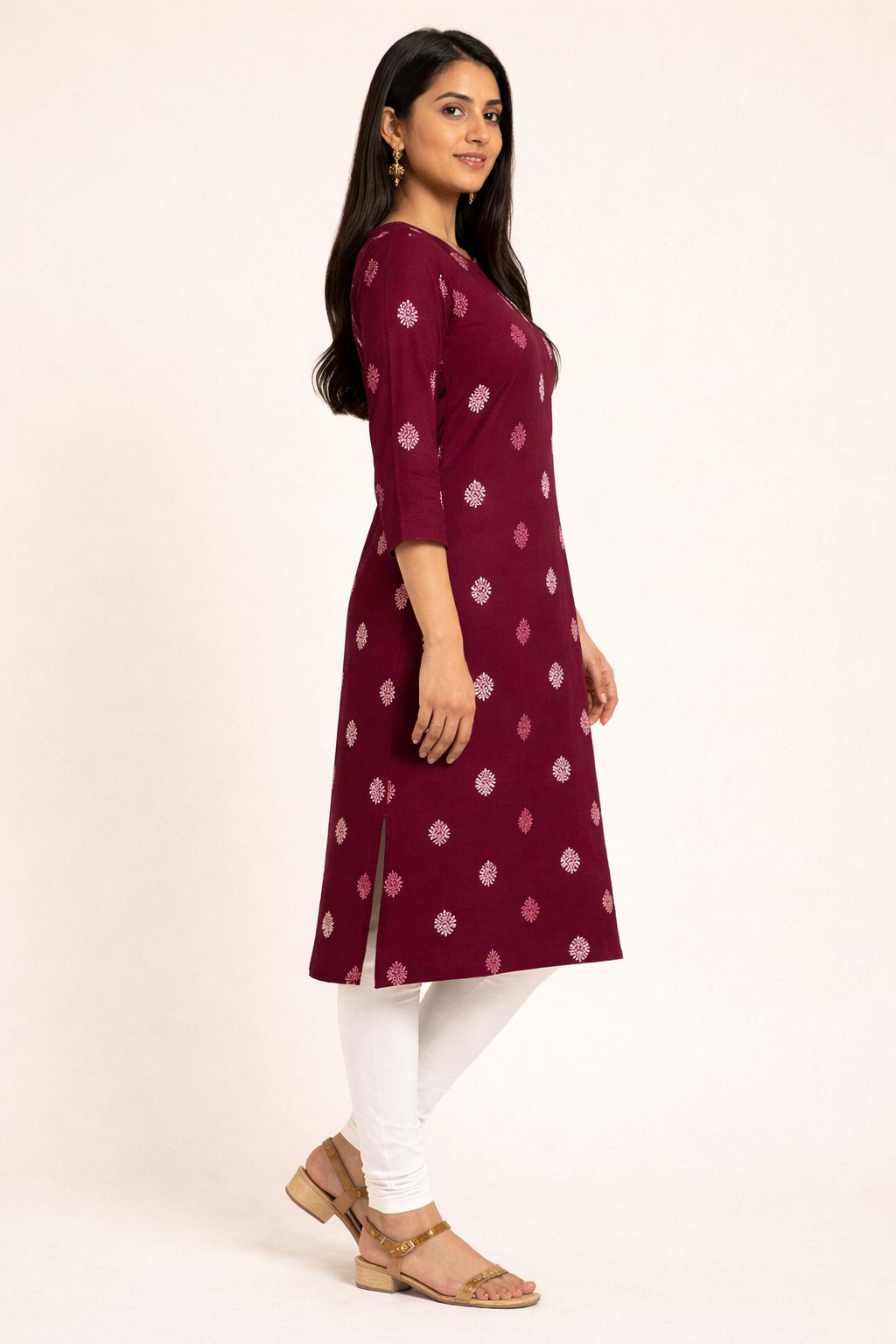 This Burgundy kurti features a beautiful and intricate design, making it a versatile piece for various occasions. The garment is made from a soft rayon fabric, which provides a comfortable drape and a smooth texture. The burgundy color is complemented by a repeating pattern of white and pink stylized floral or paisley motifs, creating a striking contrast that is both traditional and contemporary. The neckline is a classic round shape with a placket adorned with three golden buttons, adding a touch of elegance to the overall design.
