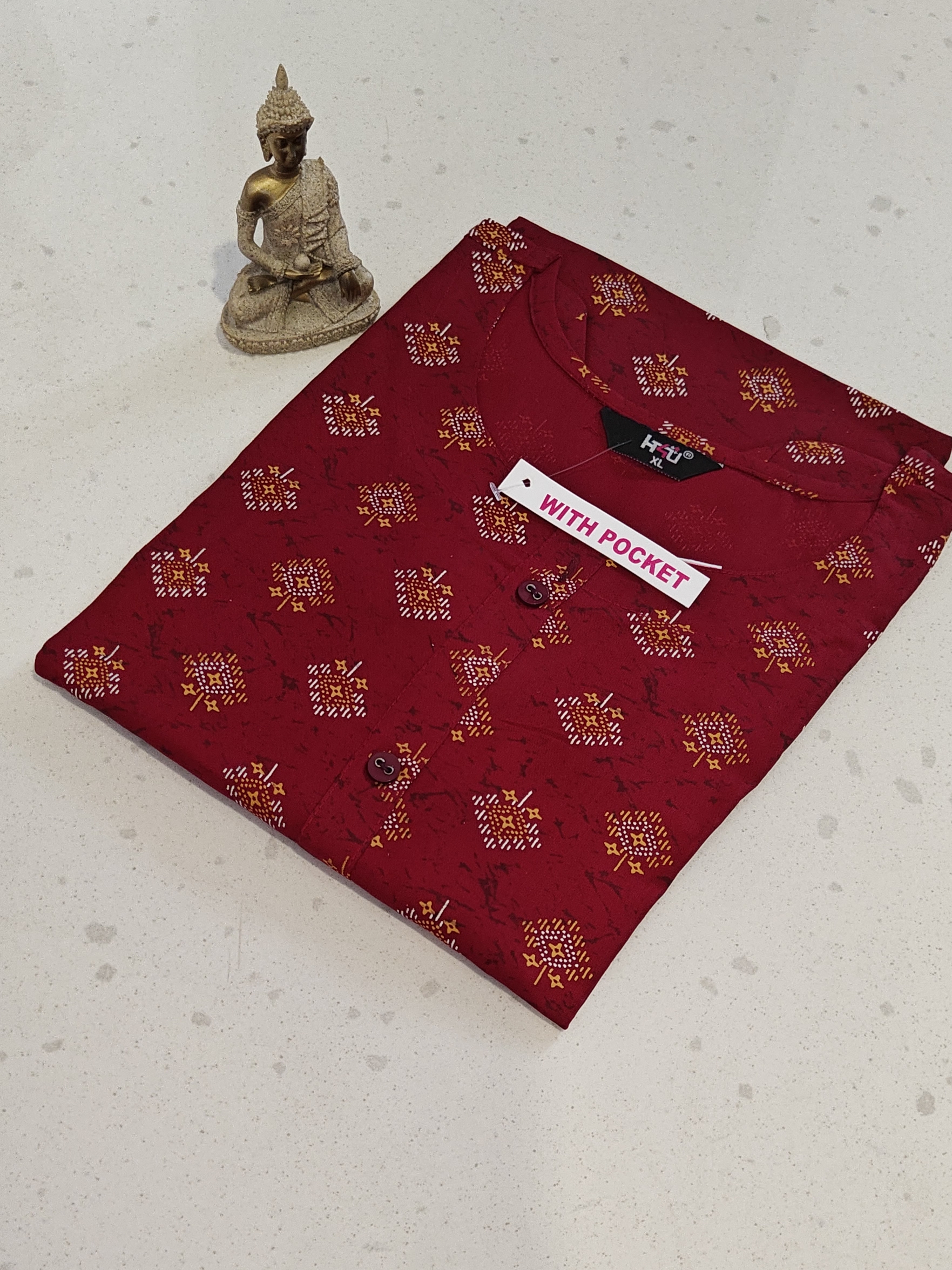 - This is a ladies’ kurti made from rayon material, which is known for its soft and comfortable feel. The garment is a deep red or maroon color and features a printed pattern of small, geometric motifs in shades of red, yellow, and white. The kurti has a round neck and a button placket. It includes a pocket. Due to its comfortable fabric and printed design, this type of kurti is suitable for casual wear, daily use, or office attire.