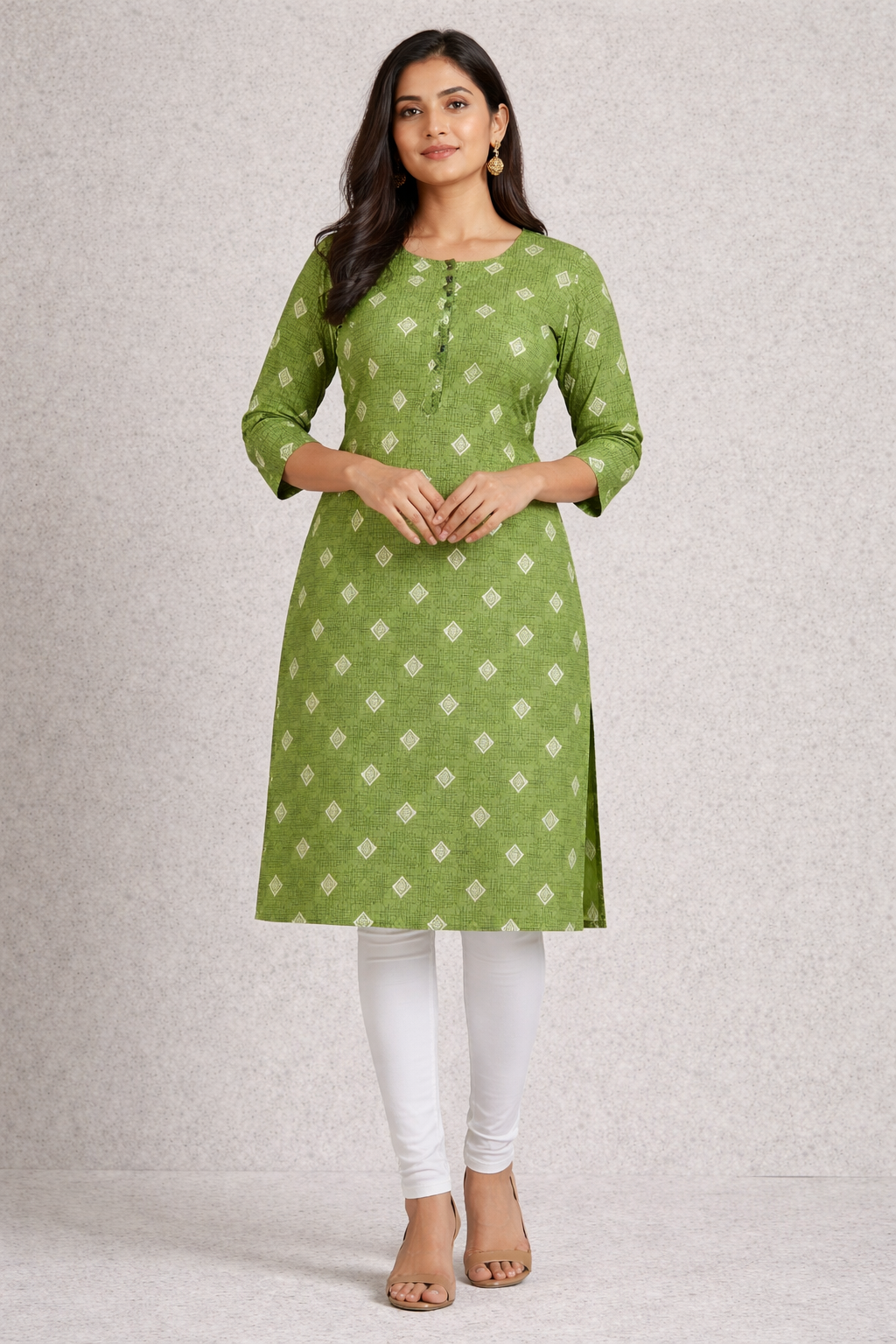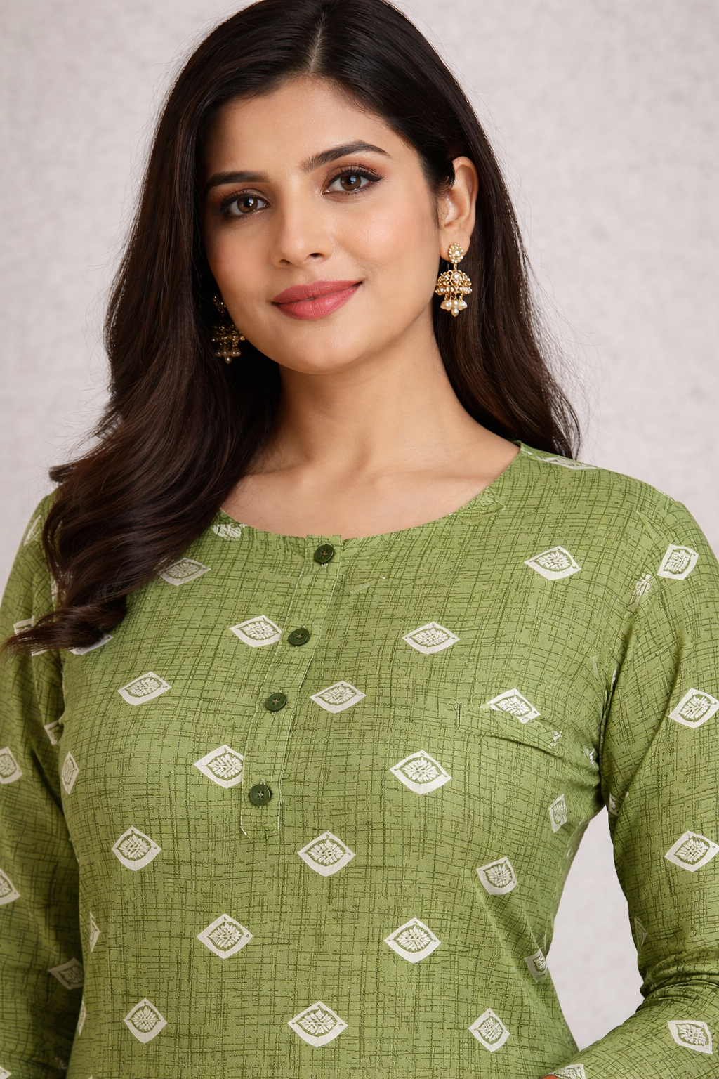 This is a green printed kurti with a pocket, made from rayon fabric.
