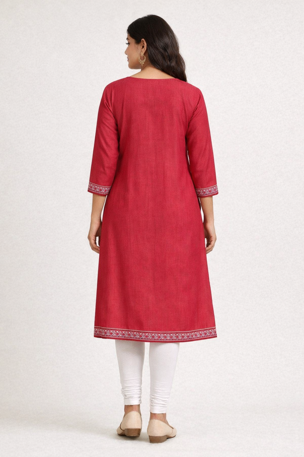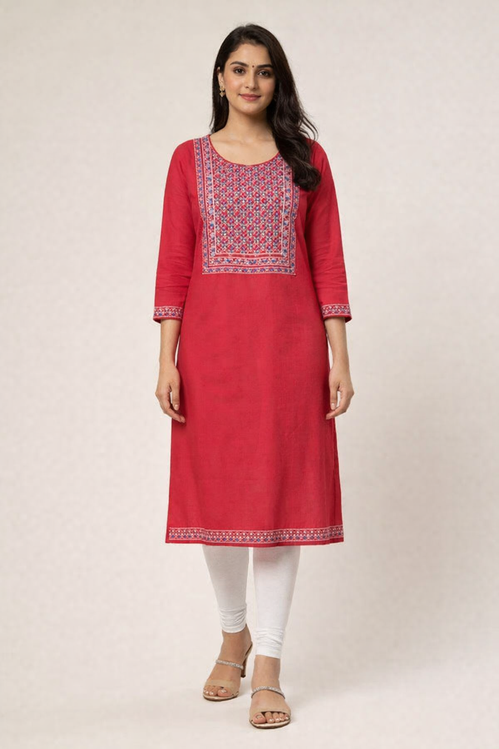 - Fit & Style: The dress has a straight A-line fit, with full-length sleeves that end in a simple cuff. It is a long kurti, likely reaching calf or knee length depending on the wearer’s height.