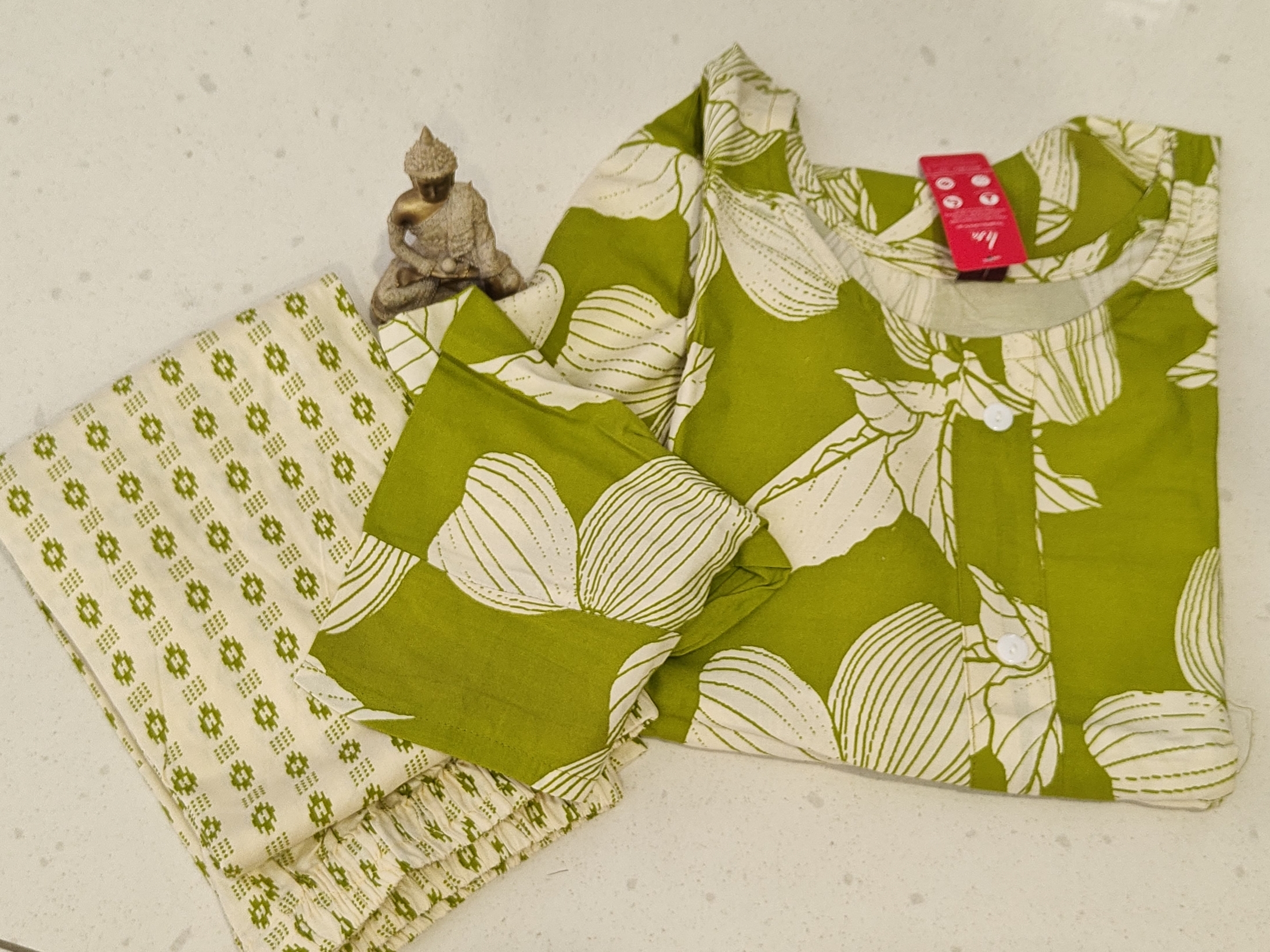 This is a two-piece dress material, commonly referred to as a kurta set, with a kurta and a pair of bottoms. The fabric of the garments is being made from natural cellulosic fibers, such as viscose or rayon, derived from wood pulp. This type of material is known for being soft, breathable, and having a fluid drape. It is also marketed as wrinkle-resistant and biodegradable.The kurta, has 3/4th length sleeves and a round neckline with a small V-cut and button detail. It is a lime green color with a white botanical or floral print. The bottoms, which appear to be pants, is a light beige with a small, repeated geometric pattern in a contrasting light green color.