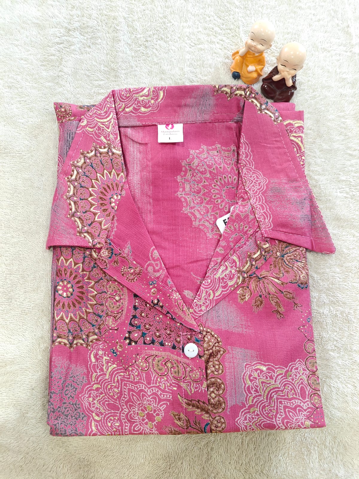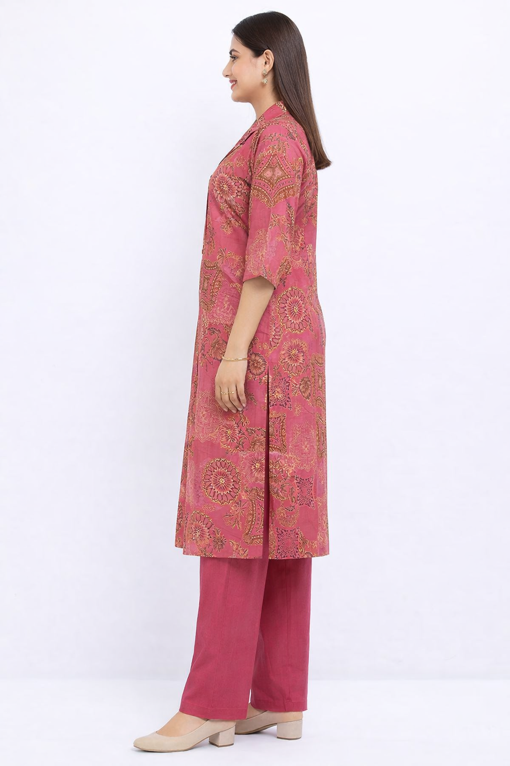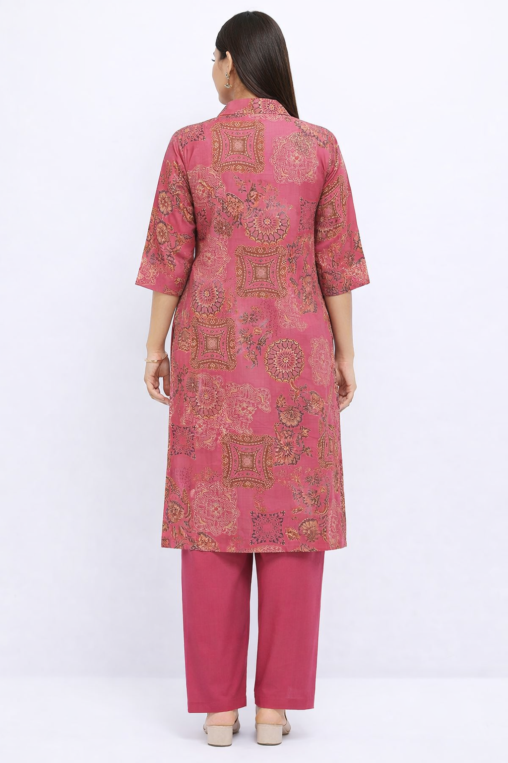 This is a two-piece women’s ethnic wear set, likely a kurta and palazzo/pant set, in shades of pink.