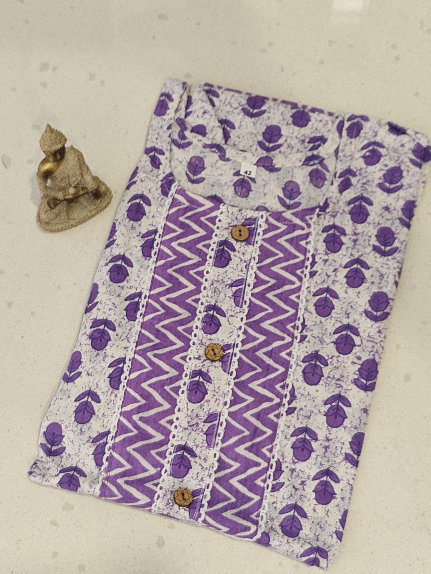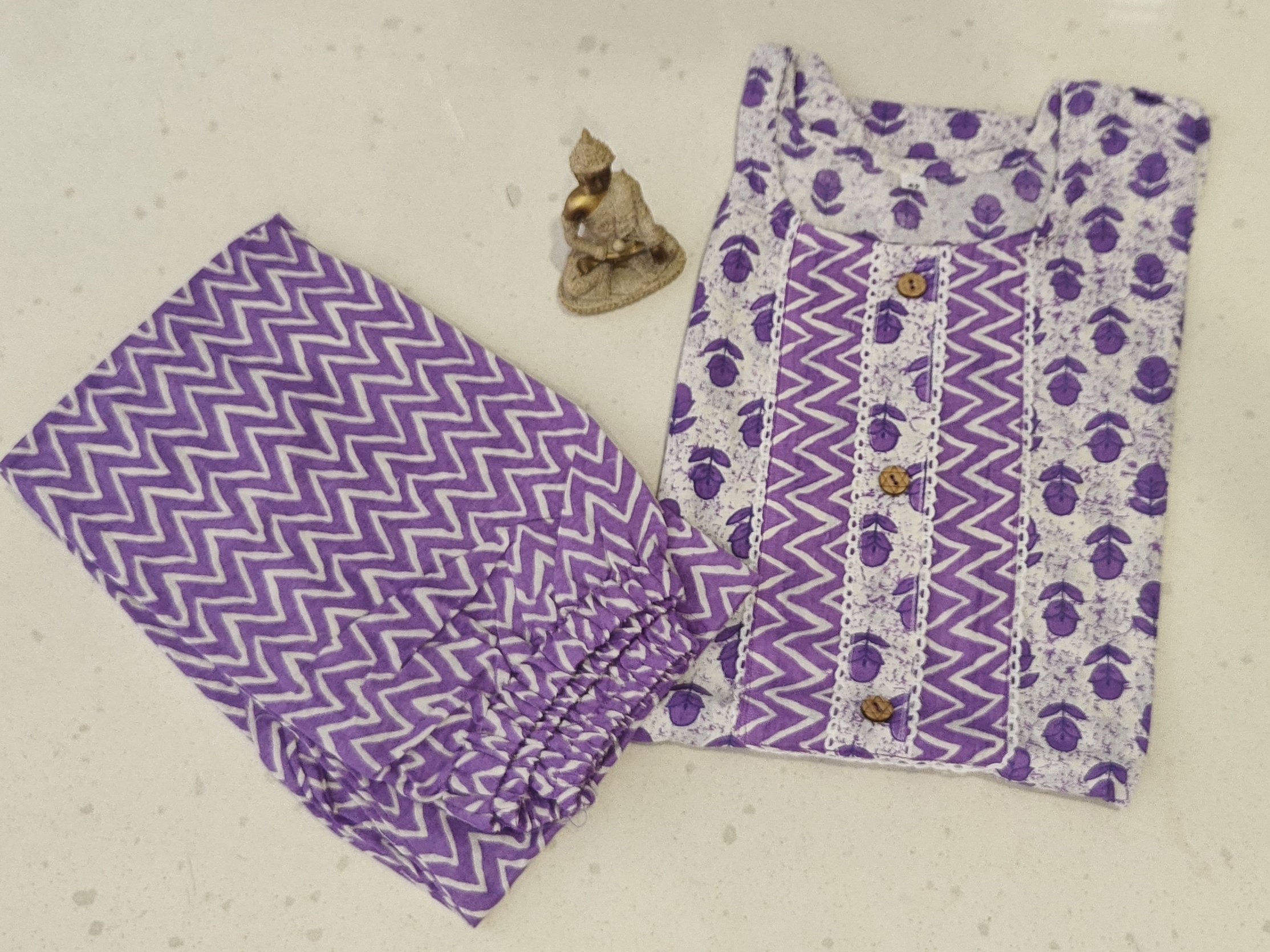 • Pattern: The kurta has a white background with a purple floral block print pattern. A central panel on the front features a purple and white chevron (zigzag) pattern, which is bordered by a white lace trim. The pants have a matching all-over purple and white chevron pattern.
