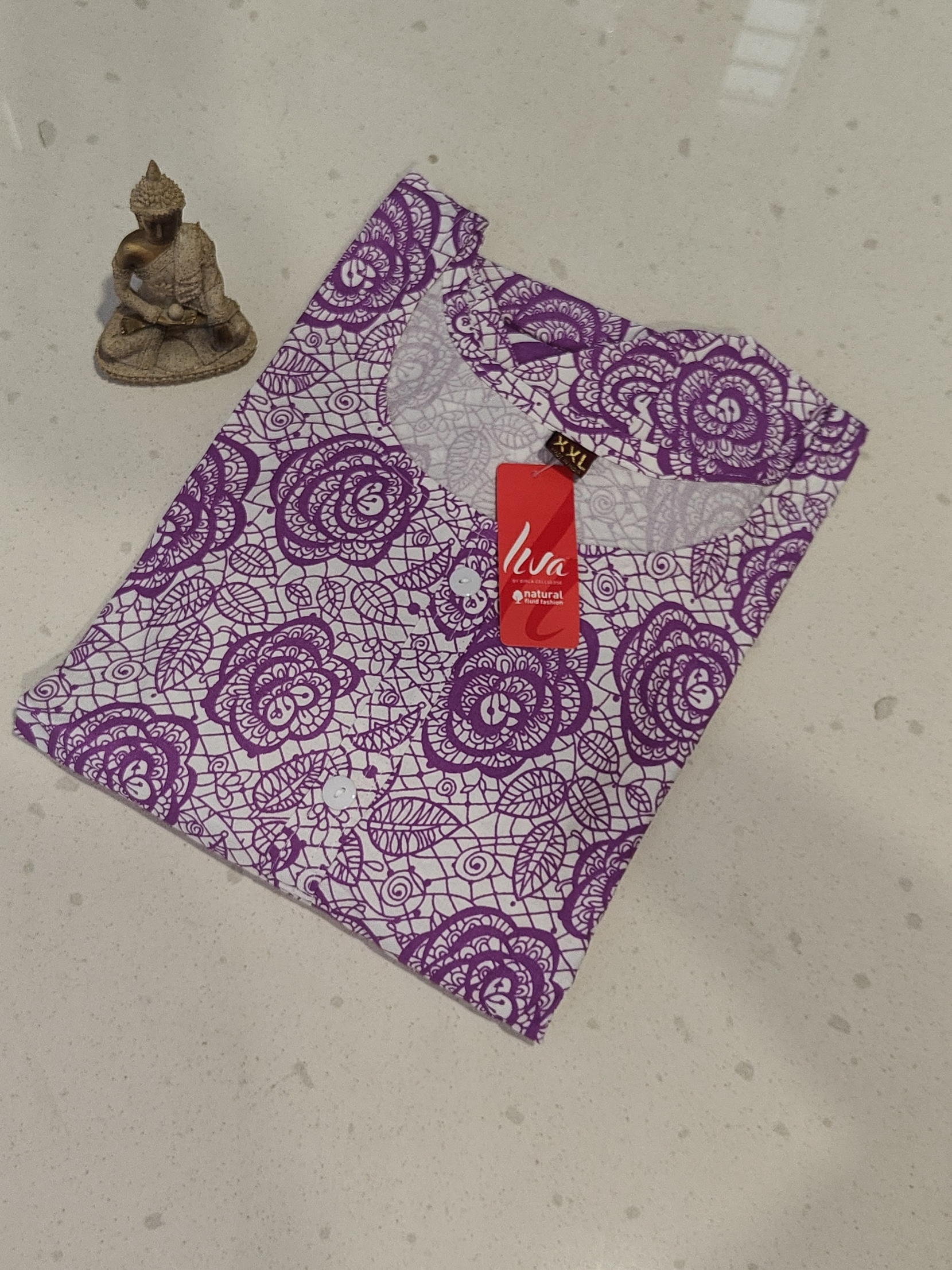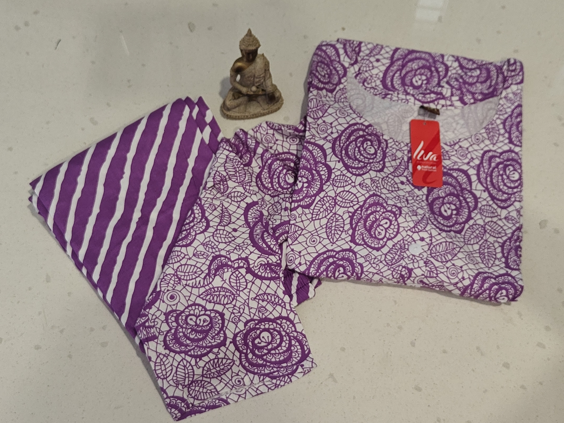 - Pattern: The kurta has a white background with a purple floral rose print pattern. The pants have a matching all-over purple and white chevron pattern.