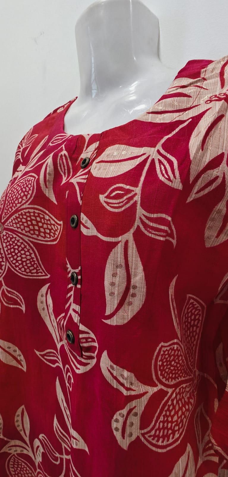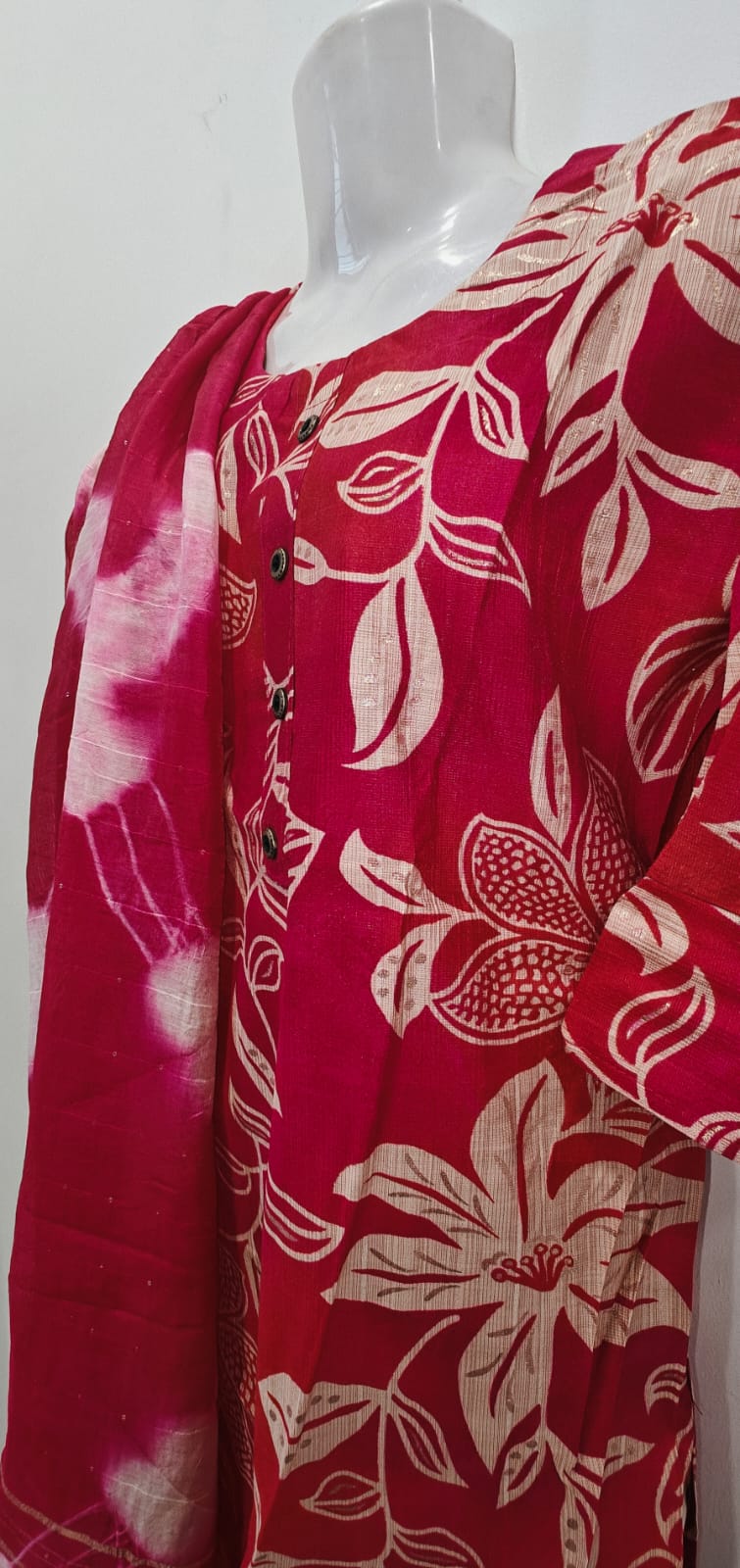 The material appears to be a comfortable, cotton fabric, given its drape and matte finish. The texture of the dupatta suggests a similar natural fiber or blend.